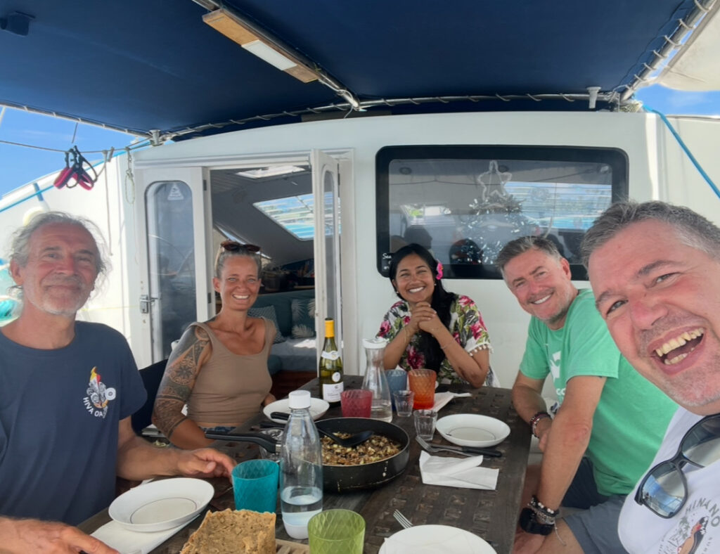 Dès le premier jour, nous sommes invités à manger sur le catamaran d’Amandine et Christian amarré dans le lagon de Rangiroa pour quelques jours.